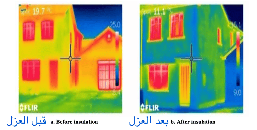 في الصورة الأولى، حيث لا يوجد عزل أو يكون ضعيفًا، يتم نقل الحرارة بسهولة من خلال الجدران وعناصر المبنى الأخرى. وبالتالي، تكون الأسطح الخارجية قريبة من اللون الأحمر والأصفر. ومن ناحية أخرى، في الصورة الثانية والتي تظهر منزل تم عزلة بواسطة شركة البيت للعوازل بعد العزل، يتم تراكم الحرارة داخل المبنى وتكون الأوجه الخارجية عندها نفس درجة حرارة البيئة، وبالتالي تظهر باللون الأزرق والأخضر.