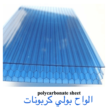 ألواح البولي كربونات: هذه الألواح خفيفة الوزن ومكونة من عدة طبقات لتتحمل الصدمات مع وجود تجاويف هوائية لأغراض العزل الحراري.